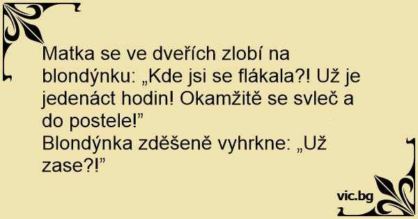 Matka se ve dveřích zlobí na blondýnku: „Kde jsi se flákala?! Už je jedenáct hodin! Okamžitě se svleč a do postele!”