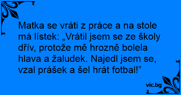 Matka se vráti z práce a na stole má lístek: „Vrátil jsem se ze školy dřív, protože mě hrozně bolela hlava a žaludek. Najedl jsem se, vzal prášek a šel hrát fotbal!”