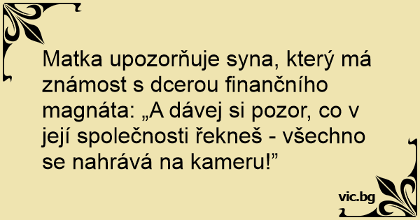 Matka upozorňuje syna, který má známost s dcerou finančního magnáta: „A dávej si pozor, co v její společnosti řekneš - všechno se nahrává na kameru!”