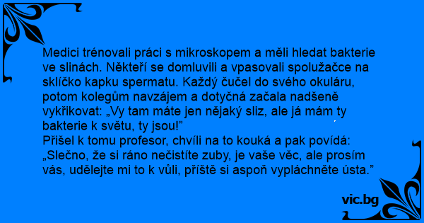 Medici trénovali práci s mikroskopem a měli hledat bakterie ve slinách. Někteří se domluvili a vpasovali spolužačce na sklíčko kapku spermatu. Každý čučel do svého okuláru, potom kolegům navzájem a dotyčná začala nadšeně vykřikovat: „Vy tam máte jen nějaký sliz, ale já mám ty bakterie k světu, ty jsou!”