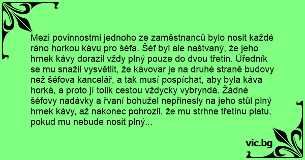 Další ráno dostal šéf hrnek kávy plný až po okraj a tak to šlo několik dalších dnů. Šéf měl radost nаd svým úspěchem a zeptal se zaměstnance na jeho techniku.