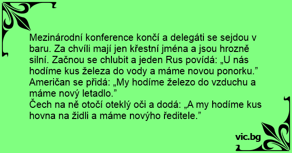 Mezinárodní konference končí a delegáti se sejdou v baru. Za chvíli mají jen křestní jména a jsou hrozně silní. Začnou se chlubit a jeden Rus povídá: „U nás hodíme kus železa do vody a máme novou ponorku.”