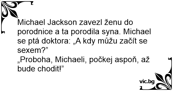 Michael Jackson zavezl ženu do porodnice a ta porodila syna. Michael se ptá doktora: „A kdy můžu začít se sexem?”