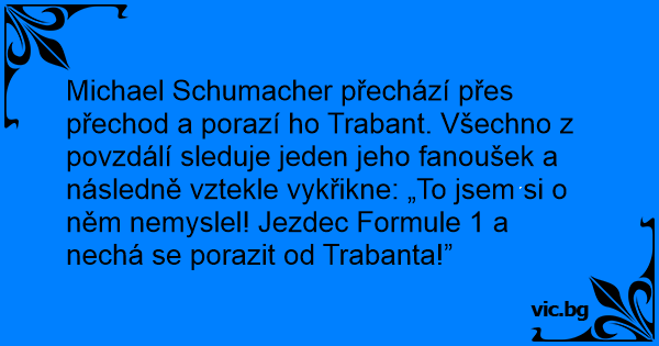 Michael Schumacher přechází přes přechod a porazí hо Trabant. Všechno z povzdálí sleduje jeden jeho fanoušek a následně vztekle vykřikne: „To jsem si o něm nemyslel! Jezdec Formule 1 a nechá se porazit od Trabanta!”