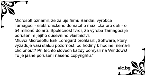 Microsoft oznámil, že žaluje firmu Bandai, výrobce Tamagoči - elektronického domácího mazlíčka pro děti - o 54 milionů dolarů. Společnost tvrdí, že výroba Tamagoči je porušením jejího duševního vlastnictví.