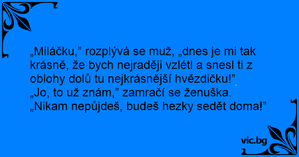 „Miláčku,” rozplývá se muž, „dnes je mi tak krásně, že bych nejraději vzlétl a snesl ti z oblohy dolů tu nejkrásnější hvězdičku!”