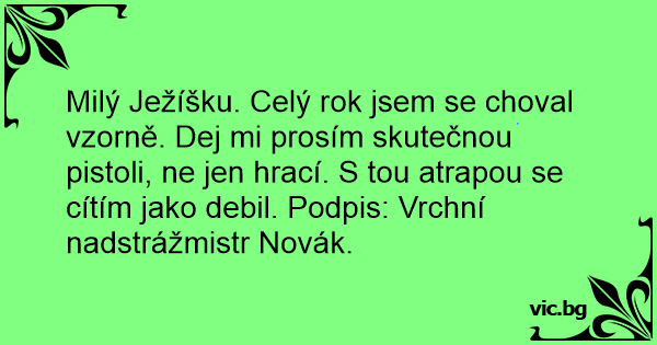 Milý Ježíšku. Celý rok jsem se choval vzorně. Dej mi prosím skutečnou pistoli, ne jen hrací. S tou atrapou se cítím jako debil. Podpis: Vrchní nadstrážmistr Novák.
