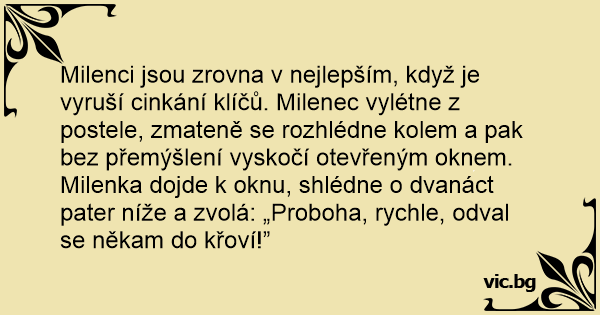 Milenci jsou zrovna v nejlepším, když je vyruší cinkání klíčů. Milenec vylétne z postele, zmateně se rozhlédne kolem a pak bez přemýšlení vyskočí otevřeným oknem. Milenka dojde k oknu, shlédne o dvanáct pater níže a zvolá: „Proboha, rychle, odval se někam do křoví!”