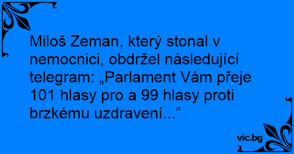 Miloš Zeman, který stonal v nemocnici, obdržel následující telegram: „Parlament Vám přeje 101 hlasy pro a 99 hlasy proti brzkému uzdravení...”