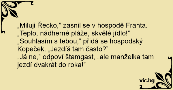 „Miluji Řecko,” zasnil se v hospodě Franta. „Teplo, nádherné pláže, skvělé jídlo!”