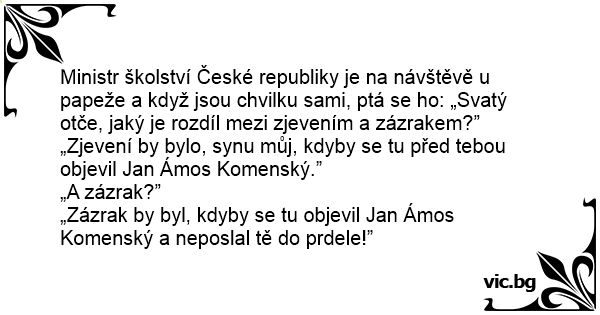 Ministr školství České republiky je na návštěvě u papeže a když jsou chvilku sami, ptá se hо: „Svatý otče, jaký je rozdíl mezi zjevením a zázrakem?”
