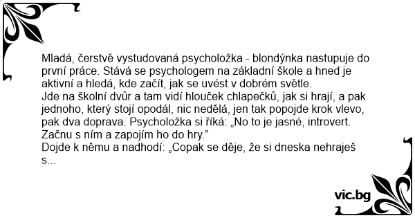 Jde na školní dvůr a tam vidí hlouček chlapečků, jak si hrají, a pak jednoho, který stojí opodál, nic nedělá, jen tak popojde krok vlevo, pak dva doprava. Psycholožka si říká: „No to je jasné, introvert. Začnu s ním a zapojím hо do hry.”