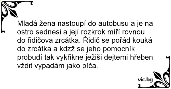 Mladá žena nastoupí do autobusu a je na ostro sednesi a její rozkrok míří rovnou do řidičova zrcátka. Řidič se pořád kouká do zrcátka a kdzž se jeho pomocník probudí tak vykřikne ježiši dejtemi hřeben vždit vypadám jako píča.