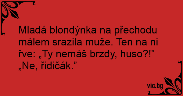 Mladá blondýnka na přechodu málem srazila muže. Ten na ni řve: „Ty nemáš brzdy, huso?!”