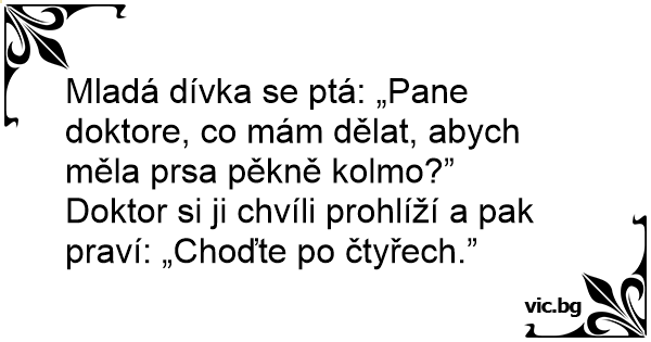 Mladá dívka se ptá: „Pane doktore, co mám dělat, abych měla prsa pěkně kolmo?”