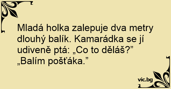 Mladá holka zalepuje dva metry dlouhý balík. Kamarádka se jí udiveně ptá: „Co to děláš?”