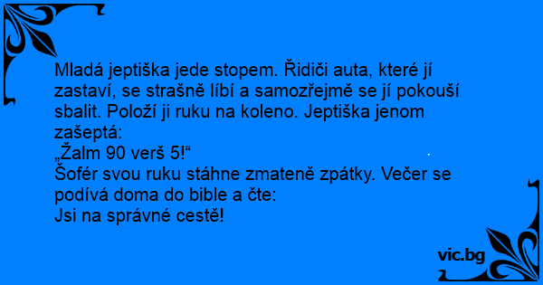 Mladá jeptiška stopuje a zastaví ji docela pohlednej mladík. Po chvilce jízdy jí položí ruku na koleno a jeptiška povídá: „Žalm 12, verš 5.” Mladík se lekne, stáhne ruku zpátky a celou cestu už dá...