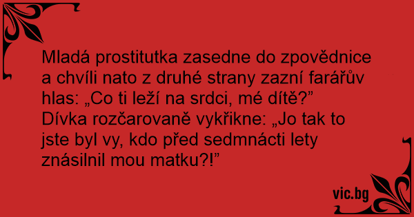 Mladá prostitutka zasedne do zpovědnice a chvíli nato z druhé strany zazní farářův hlas: „Co ti leží na srdci, mé dítě?”