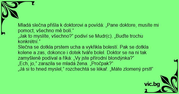 This Joke Hurts Blonde in Pain Πονάω παντού Το σπασμένο δάχτυλο На някаква сватба станало сбиване и всички били прибрани в ареста. Ein Mann kommt zum Arzt. Един отива на лекар, влиза при доктора и започва: A young brunette goes into the doctor's office and says that her body hurts wherever she touches it. Blonde walks into a doctors office and says: Kommt ein Mann zum Arzt: A woman runs into a doctor’s office and says “DOCTOR! DOCTOR! You have to help me! Everywhere I touch on my body it hurts!” Блондинка зашла к доктору: A blonde goes to her doctor complaining of body pains. Her doctor asked "Where does it hurt?" She touches her elbow and says, "here." She then touches her knee and says "here too." The doctor asks if it hurts anywhere else. She says it seems to be everything she touches hurts. The doctor says,... Geht eine Frau zum Arzt und sagt: "Wenn ich hier drücke tut es weh, wenn ich hier drücke tut es weh und wenn ich hier drücke tut es weh." Da sagt der Arzt: "Nartürlich weil ihr Finger Gebrochen ist!" Une blonde va chez le medecin et lui dit: -"Docteur...quand j'appuie là, j'ai maaal!!! et quand j'appuie au genou, j'ai maaal!!! et puis quand j'appuie a l'épaule, j'ai maaal!!!" Et le médecin lui répond: -"C'est normal Mlle, vous avez le doigt cassé!"..... Carabiniere dal dottore: "Dottore, se mi tocco qui ho male (indicando il fegato). Pure se mi tocco qui ho male (indicando la milza). E anche se mi tocco qui (indicando il gomito).Ecc, ecc. Cosa puo' essere?". Il dottore: "Mi sa che lei ha un dito fratturato! A young woman said to her doctor, 'You have to help me, I hurt all over.' 'What do you mean?' said the doctor. The woman touched her right knee with her index finger and yelled,'Ow, that hurts.' Then she touched her left cheek and again yelled, 'Ouch! That hurts, too.' Then she touched her right... - ¡Doctor, doctor! Cuando me toco aquí me duele mucho, si me toco aquí también me duele; y me toco allí ¡me sigue doliendo! ¿Que tengo? - Un dedo roto. Der Patient zu seinem Arzt: "Ich bin schwer krank und habe Schmerzen am ganzen Körper. Wenn ich mir mit dem Finger an den Kopf tippe tut es weh, wenn ich mir an den Hals tippe tut es weh, wenn ich... Doctor, Doctor Me duele todoo... Mire me toko aki con el deo y me duele aki tambie,y aki! -Doctor dice: Usted lo k tiene es el deo roto. Le gars va chez le docteur et lui dit: - Lorsque je me touche ici, ça me fait mal (en se touchant une épaule), - Lorsque je me touche ici, ça me fait mal (en se touchant un coude), - Lorsque je me... A blonde went to the hospital because her body hurt. She told the doctor that where ever she touched herself it would hurt. The doctor told her to demonstrate. She touched her elbow and it hurt.... "Herr Doktor, wenn ich auf den Kopf drücke, tut´s weh, wenn ich auf´s Bein drücke, tut´s weh, wenn ich auf den Bauch drücke, tut´s weh, und wenn ich auf den Arm drücke, tut´s auch weh." "Ja, da... Une jeune femme blonde va voir son docteur. - "Ou avez-vous mal ?" Demande le docteur. - "Vous devez m'aider, j'ai mal partout." Répond la jeune femme. - "Que voulez-vous dire , partout?"...... En brunett går till läkaren. – Vad kan jag hjälpa dig med? – Jo, jag har så ont, jag tror jag har brutit varenda ben i kroppen! – Men snälla du, det är ju inte möjligt, säger läkaren. – Jo visst,... En ung brunett gick till doktorn och berättade att det gör ont på kroppen överallt där hon rör den. Omöjligt, sa doktorn. Visa mig. Hon tar fingret och trycker på armbågen och skriker högt av... Temel bir gün doktora gitmiş ve meramını doktora aktarmış: – Doktor bey parmağımı karnıma bastırıyorum acıyor, omzuma bastırıyorum acıyor, kalbime bastırıyorum acıyor, kafama bastırıyorum acıyor,... Een jonge brunette gaat de praktijk van de dokter binnen en zegt dat haar lichaam overal pijn doet, waar ze het ook aanraakt. "Dat kan bijna niet," zegt de dokter, "Toon het eens." Ze neemt haar... Er kwam een man bij een dokter, hij moest een momentje wachten in de wachtkamer. Toen hij aan de beurt was vertelde de man wat er aan de hand was “Wanneer ik mijn been aanraak heb ik pijn, wanneer... En ung tjej, hon var brunett, gick till doktorn. Doktorn: - Vad har hänt med dig då? Brunetten: - Jag har ont överallt, var jag än trycker. Brunetten började genast att trycka på olika delar av... En mann gikk til legen og sa: – Jeg har vondt over alt, når jeg tar på armen, på beinet, i ansiktet. Legen så på mannen og sa: – Du har jo sår på fingeren. Een jonge vrouw komt bij haar dokter met klachten over pijn. "Waar doet het zeer?" vraagt de dokter. "Het doet overal zeer, u moet me helpen", antwoordt de vrouw. "Wat bedoelt u met overal?" vraagt... - Doktor, jeg har vondt samme hvor på kroppen jeg trykker med fingeren. - Det kan jo skyldes at fingeren er brukket! O português reclama de fortes dores ao seu médico: — Ai doutore, cá estou eu com dores fortes pelo corpo todo; eu ponho a mão aqui no peito... Ai! A mão nas costas... Ui! Até na minha cabeça dói...... A brunette goes to the doctor and as she touches each part of her body with her finger she says, "Doctor it hurts everywhere. My leg hurts, my arm hurts, my neck hurts, and even my head hurts!" The... The retired man goes to the doctor and says, "Doc, I ache all over. Everywhere I touch it hurts." The doctor replies, "OK. Touch your elbow." The guy touches his elbow and winces in genuine... A Blonde walks into a hospital claiming that everywhere she touches hurts. So she goes into the examination room and the doctor says “Okay I’d like you to point to wherever it hurts”. So the Blonde... En man kommer in hos doktorn: – Snälla doktorn, hjälp mig. Det gör ont när jag gör så här, säger han och pekar på sin näsa. Det gör också on
