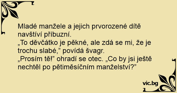 „Prosím tě!” ohradí se otec. „Co by jsi ještě nechtěl po pětiměsíčním manželství?”
