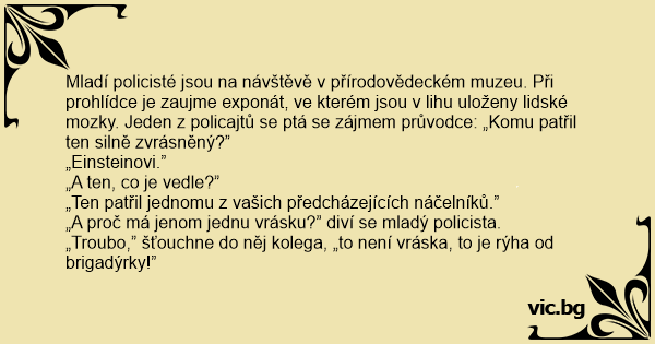 Mladí policisté jsou na návštěvě v přírodovědeckém muzeu. Při prohlídce je zaujme exponát, ve kterém jsou v lihu uloženy lidské mozky. Jeden z policajtů se ptá se zájmem průvodce: „Komu patřil ten silně zvrásněný?”