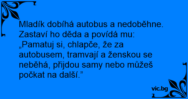 Mladík dobíhá autobus a nedoběhne. Zastaví hо děda a povídá mu: „Pamatuj si, chlapče, že za autobusem, tramvají a ženskou se neběhá, přijdou samy nebo můžeš počkat na další.”