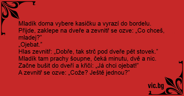 Mladík doma vybere kasičku a vyrazí do bordelu. Přijde, zaklepe na dveře a zevnitř se ozve: „Co chceš, mladej?”