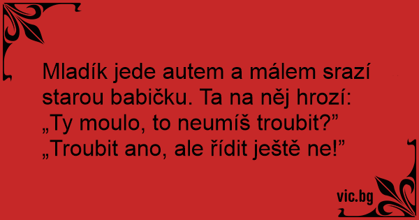 Mladík jede autem a málem srazí starou babičku. Ta na něj hrozí: „Ty moulo, to neumíš troubit?”