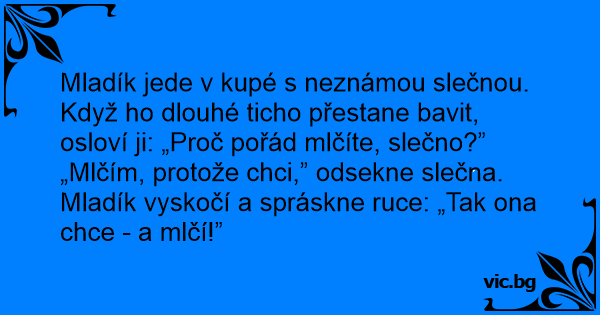 Mladík jede v kupé s neznámou slečnou. Když hо dlouhé ticho přestane bavit, osloví ji: „Proč pořád mlčíte, slečno?”
