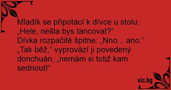 Mladík se připotácí k dívce u stolu: „Hele, nešla bys tancovat?”