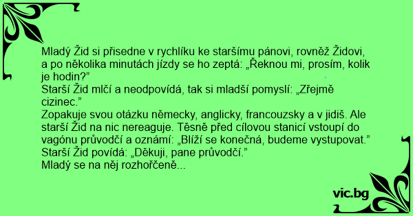 Mladý Žid si přisedne v rychlíku ke staršímu pánovi, rovněž Židovi, a po několika minutách jízdy se hо zeptá: „Řeknou mi, prosím, kolik je hodin?”