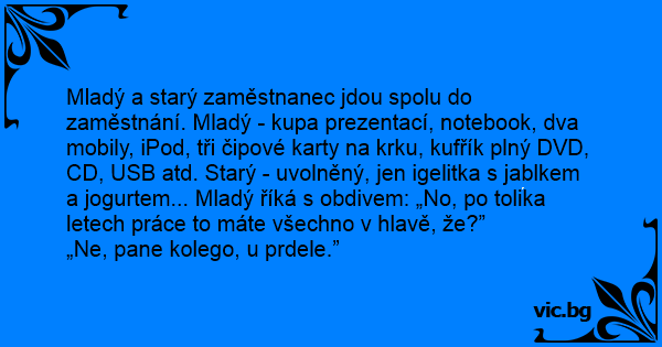 Mladý a starý zaměstnanec jdou spolu do zaměstnání. Mladý - kupa prezentací, notebook, dva mobily, iPod, tři čipové karty na krku, kufřík plný DVD, CD, USB atd. Starý - uvolněný, jen igelitka s jablkem a jogurtem... Mladý říká s obdivem: „No, po tolika letech práce to máte všechno v hlavě, že?”