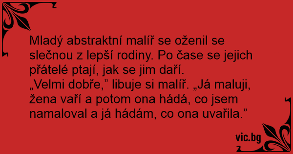 „Velmi dobře,” libuje si malíř. „Já maluji, žena vaří a potom ona hádá, co jsem namaloval a já hádám, co ona uvařila.”