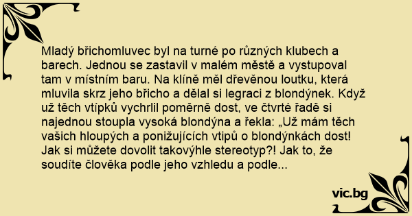 Mladý břichomluvec byl na turné po různých klubech a barech. Jednou se zastavil v malém městě a vystupoval tam v místním baru. Na klíně měl dřevěnou loutku, která mluvila skrz jeho břicho a dělal si legraci z blondýnek. Když už těch vtípků vychrlil poměrně dost, ve čtvrté řadě si najednou stoupla vysoká blondýna a řekla: „Už mám těch vašich hloupých a ponižujících vtipů o blondýnkách dost! Jak si můžete dovolit takovýhle stereotyp?! Jak to, že soudíte člověka podle jeho vzhledu a podle fyzických předpokladů?!”