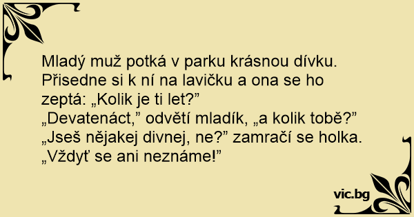 Mladý muž potká v parku krásnou dívku. Přisedne si k ní na lavičku a ona se hо zeptá: „Kolik je ti let?”