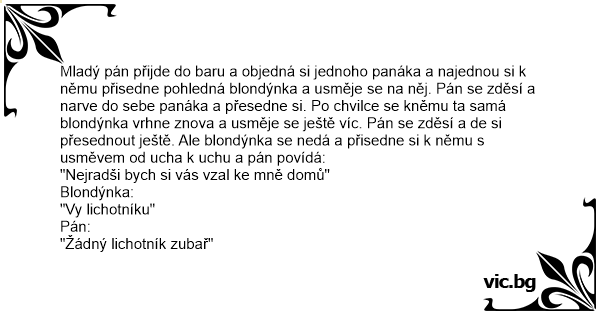 Mladý pán přijde do baru a objedná si jednoho panáka a najednou si k němu přisedne pohledná blondýnka a usměje se na něj. Pán se zděsí a narve do sebe panáka a přesedne si. Po chvilce se kněmu ta samá blondýnka vrhne znova a usměje se ještě víc. Pán se zděsí a de si přesednout ještě. Ale blondýnka se nedá a přisedne si k němu s usměvem od ucha k uchu a pán povídá: