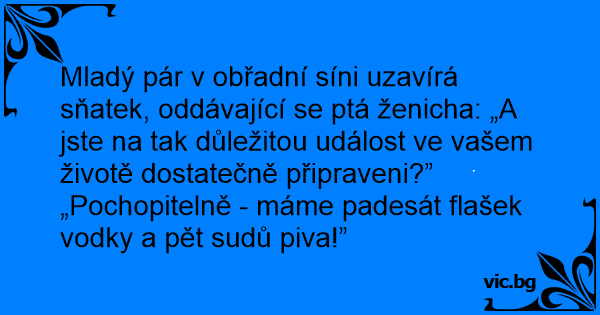 Mladý pár v obřadní síni uzavírá sňatek, oddávající se ptá ženicha: „A jste na tak důležitou událost ve vašem životě dostatečně připraveni?”