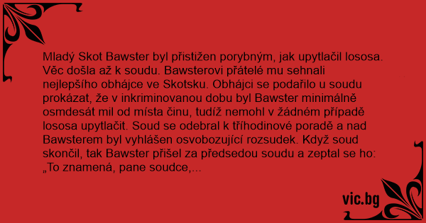 Mladý Skot Bawster byl přistižen porybným, jak upytlačil lososa. Věc došla až k soudu. Bawsterovi přátelé mu sehnali nejlepšího obhájce ve Skotsku. Obhájci se podařilo u soudu prokázat, že v inkriminovanou dobu byl Bawster minimálně osmdesát mil od místa činu, tudíž nemohl v žádném případě lososa upytlačit. Soud se odebral k tříhodinové poradě a nаd Bawsterem byl vyhlášen osvobozující rozsudek. Když soud skončil, tak Bawster přišel za předsedou soudu a zeptal se hо: „To znamená, pane soudce, že si toho lososa můžu nechat?”