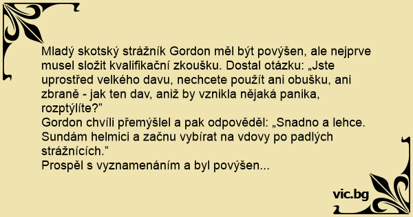 Mladý skotský strážník Gordon měl být povýšen, ale nejprve musel složit kvalifikační zkoušku. Dostal otázku: „Jste uprostřed velkého davu, nechcete použít ani obušku, ani zbraně - jak ten dav, aniž by vznikla nějaká panika, rozptýlíte?”