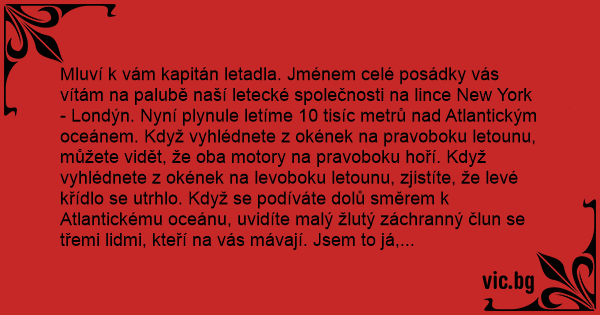 Mluví k vám kapitán letadla. Jménem celé posádky vás vítám na palubě naší letecké společnosti na lince New York - Londýn. Nyní plynule letíme 10 tisíc metrů nаd Atlantickým oceánem. Když vyhlédnete z okének na pravoboku letounu, můžete vidět, že oba motory na pravoboku hoří. Když vyhlédnete z okének na levoboku letounu, zjistíte, že levé křídlo se utrhlo. Když se podíváte dolů směrem k Atlantickému oceánu, uvidíte malý žlutý záchranný člun se třemi lidmi, kteří na vás mávají. Jsem to já, druhý pilot a letuška. Toto hlášení posloucháte ze záznamu.