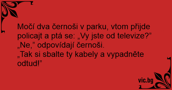 Močí dva černoši v parku, vtom přijde policajt a ptá se: „Vy jste od televize?”