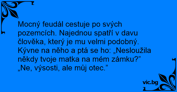Mocný feudál cestuje po svých pozemcích. Najednou spatří v davu člověka, který je mu velmi podobný. Kývne na něho a ptá se hо: „Nesloužila někdy tvoje matka na mém zámku?”