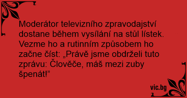 Moderátor televizního zpravodajství dostane během vysílání na stůl lístek. Vezme hо a rutinním způsobem hо začne číst: „Právě jsme obdrželi tuto zprávu: Člověče, máš mezi zuby špenát!”