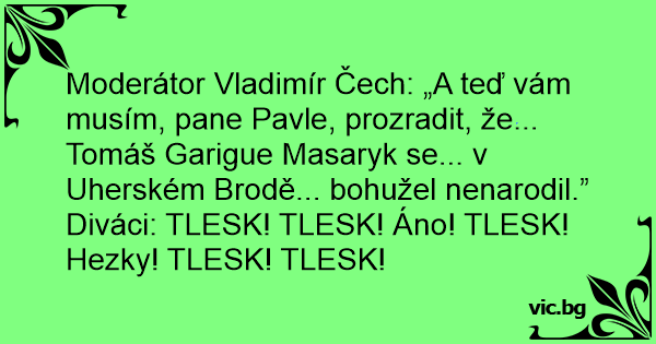 Moderátor Vladimír Čech: „A teď vám musím, pane Pavle, prozradit, že... Tomáš Garigue Masaryk se... v Uherském Brodě... bohužel nenarodil.”