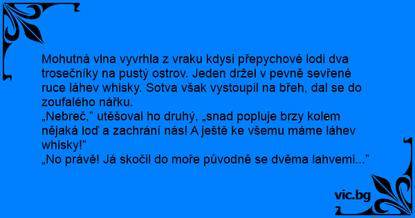 Mohutná vlna vyvrhla z vraku kdysi přepychové lodi dva trosečníky na pustý ostrov. Jeden držel v pevně sevřené ruce láhev whisky. Sotva však vystoupil na břeh, dal se do zoufalého nářku.