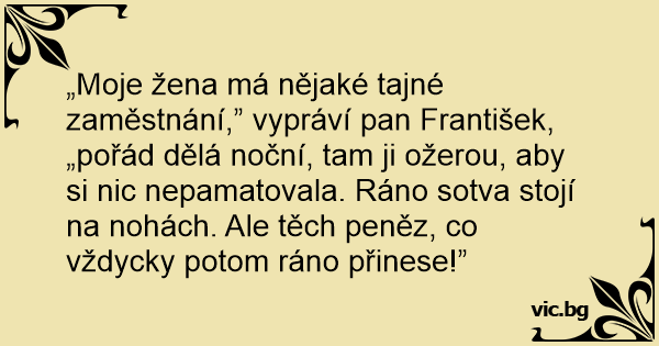 „Moje žena má nějaké tajné zaměstnání,” vypráví pan František, „pořád dělá noční, tam ji ožerou, aby si nic nepamatovala. Ráno sotva stojí na nohách. Ale těch peněz, co vždycky potom ráno přinese!”
