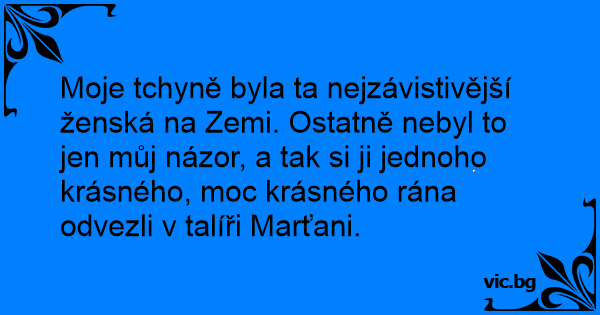 Moje tchyně byla ta nejzávistivější ženská na Zemi. Ostatně nebyl to jen můj názor, a tak si ji jednoho krásného, moc krásného rána odvezli v talíři Marťani.