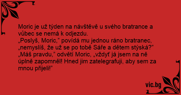„Poslyš, Moric,” povídá mu jednou ráno bratranec, „nemyslíš, že už se po tobě Sáře a dětem stýská?”