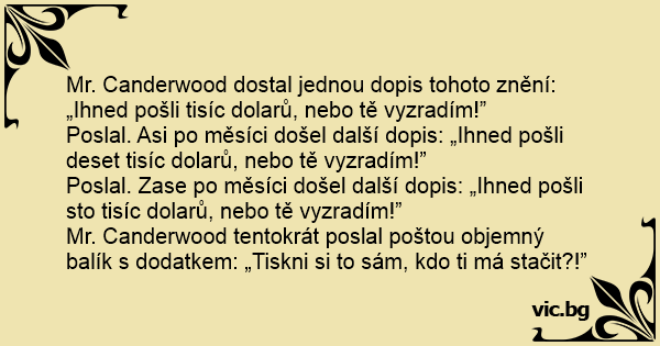 Mr. Canderwood dostal jednou dopis tohoto znění: „Ihned pošli tisíc dolarů, nebo tě vyzradím!”
