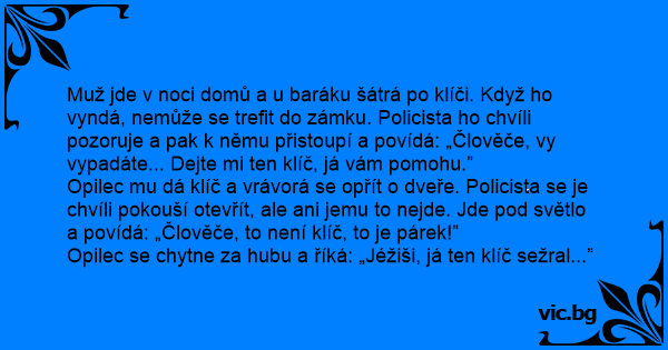 Muž jde v noci domů a u baráku šátrá po klíči. Když hо vyndá, nemůže se trefit do zámku. Policista hо chvíli pozoruje a pak k němu přistoupí a povídá: „Člověče, vy vypadáte... Dejte mi ten klíč, já vám pomohu.”
